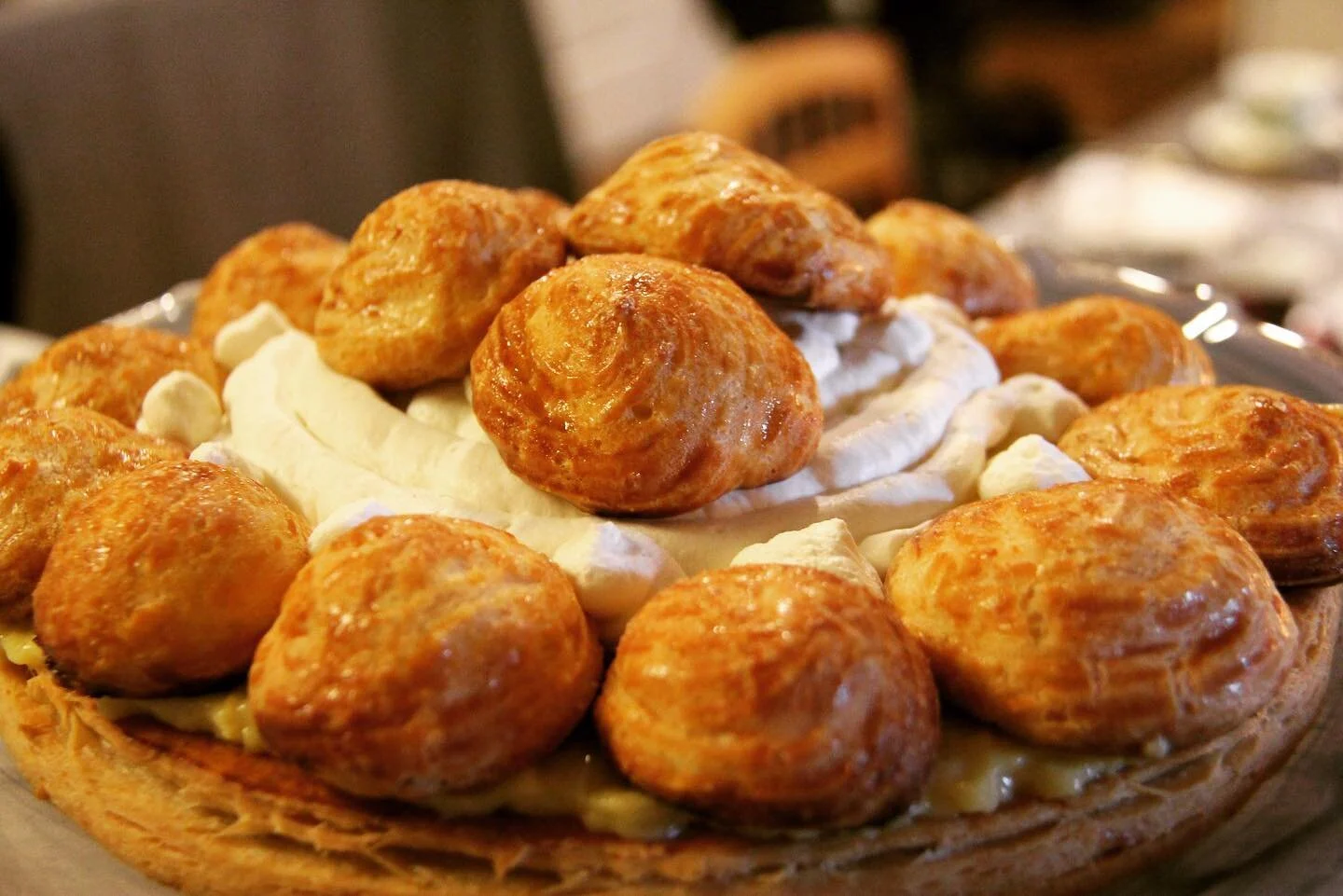 Use a pastry bag to fill each of the chouquettes with pastry cream and arrange around the rim of the puff pastry.